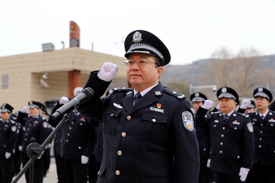 郭庆祥强调,全体民警要紧紧团结在以习近平同志为核心的党中央周围,高举习近平新时代中国特色社会主义思想伟大旗帜,增强“四个意识”、坚定“四个自信”、做到“两个维护”,始终以党的旗帜为旗帜,以党的方向为方向,以党的意志为意志,将忠诚的政治基因铸于警魂、融入血脉,让旗帜引领火热的实践,让使命点燃奋斗的激情;始终以警旗为指引,铸魂强基、擎旗奋进,以最强党性铸就忠诚之盾,以最严措施织密安全之网,以最硬作风恪尽维稳之责;始终以训词为号令,牢记嘱托、感恩奋进,高扬奋进之志、激荡奋进之力、永葆奋进之姿,全力护航山川秀美新甘肃建设,奋力谱写新时代天水公安工作新篇章,以忠诚使命、担当作为向党和人民交上一份满意的答卷。