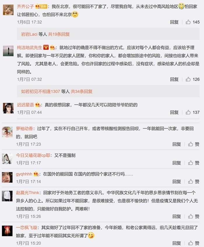 “我在北京,很可能回不了家了。”一位在京工作的网友表示出担忧,“从未去过中高风险地区,怕回家让邻居担心,也怕回不来北京”。还有很多网友在社交平台表示,“去年就没有回家,今年真的想回家。”