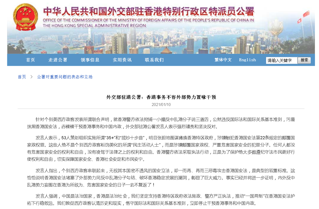 1月10日,针对个别美西方政客发表所谓联合声明,就香港警方依法拘捕一小撮反中乱港分子说三道四,公然违反国际法和国际关系基本准则,污蔑抹黑香港国安法,赤裸裸干预香港事务和中国内政,外交部驻港公署发言人表示强烈谴责和坚决反对。