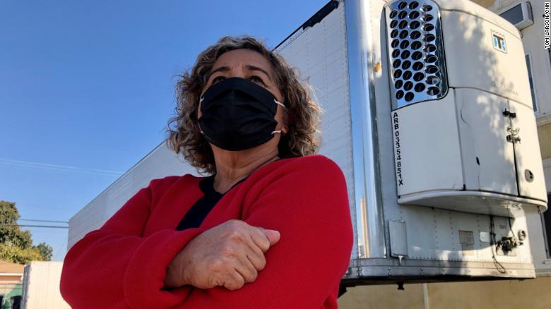 △殡仪馆老板马尔多纳多站在她最近买来存放几十具尸体的冷藏拖车前(图片来自CNN)