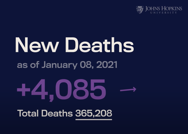 △据美国约翰斯·霍普金斯大学统计数据显示,1月7日,美国新增新冠肺炎死亡病例达4085例
