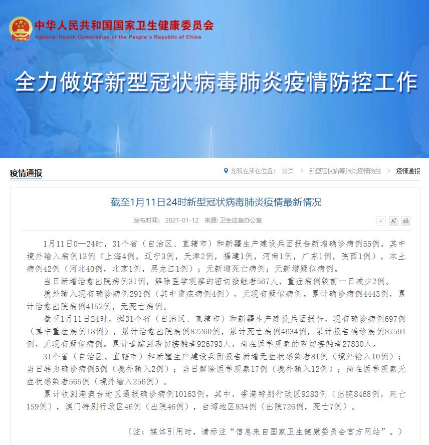 1月11日0—24时,31个省(自治区、直辖市)和新疆生产建设兵团报告新增确诊病例55例,其中境外输入病例13例(上海4例,辽宁3例,天津2例,福建1例,河南1例,广东1例,陕西1例),本土病例42例(河北40例,北京1例,黑龙江1例);无新增死亡病例;无新增疑似病例。