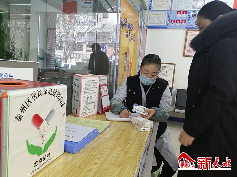 一位中年妇女刚好拿着家里的存放的几瓶过期药品来到药店,在药店工作人员指引下首先进行药品的登记,在登记结束后,药店的工作人员才将药品放入由秦州区市场监督管理局专门制作的“秦州区居民家庭过期药品”的回收箱,回收箱的一侧还放有秦州区市场监督管理局印发的、关于居民家庭过期药品回收的传单等等。