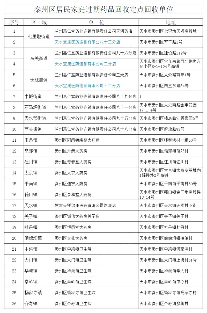 附:秦州区居民家庭过期药品回收定点回收单位名称