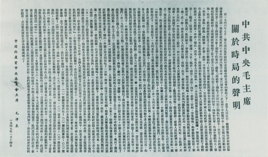 毛泽东以中共中央主席名义发表《关于时局的声明》。声明指出:南京国民党反动政府,在其反动的卖国的内政外交基本政策的基础之上所举行的国内战争,业已陷全国人民于水深火热之中,南京国民党反动政府决不能逃脱自己应负的全部责任。但是,为了迅速结束战争,实现真正的和平,减少人民的痛苦,中国共产党愿意和南京国民党反动政府及其他任何国民党地方政府和军事集团,在下列条件的基础之上进行和平谈判。这些条件是:(一)惩办战争罪犯;(二)废除伪宪法;(三)废除伪法统;(四)依据民主原则改编一切反动军队;(五)没收官僚资本;(六)改革土地制度;(七)废除卖国条约;(八)召开没有反动分子参加的政治协商会议,成立民主联合政府,接收南京国民党反动政府及其所属各级政府的一切权力。上述各项条件反映了全国人民的公意,只有在上述各项条件之下所建立的和平,才是真正的民主的和平。声明还要求中国人民解放军全体指战员,在国民党反动政府接受并实现真正的民主的和平以前,丝毫也不应当松懈自己的战斗努力。对于任何敢于反抗的反动派,必须坚决、彻底、干净、全部地歼灭之。这个声明收入《毛泽东选集》第四卷。