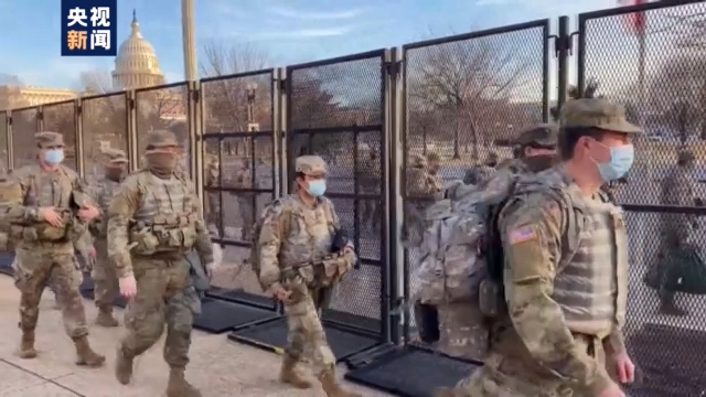 连日来,美国首都华盛顿的安保措施日趋严密,国民警卫队队员荷枪实弹巡逻。五角大楼日前宣布,已派遣2.5万名国民警卫队士兵协助总统就职典礼的安保工作。