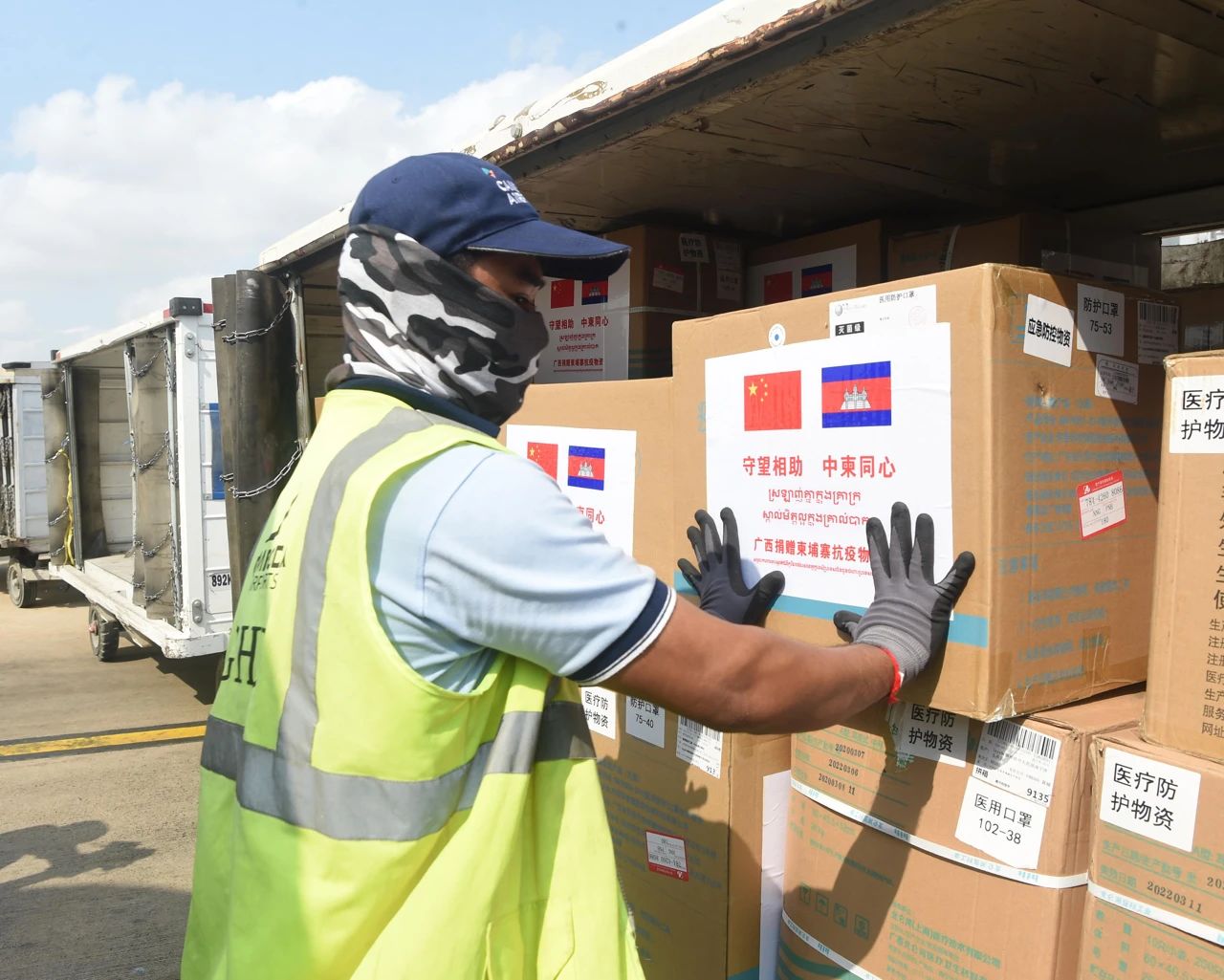 △2020年3月23日,一架搭载7名来自广西壮族自治区医疗专家和一批防疫医疗物资的中国南航包机降落在柬埔寨首都金边国际机场。