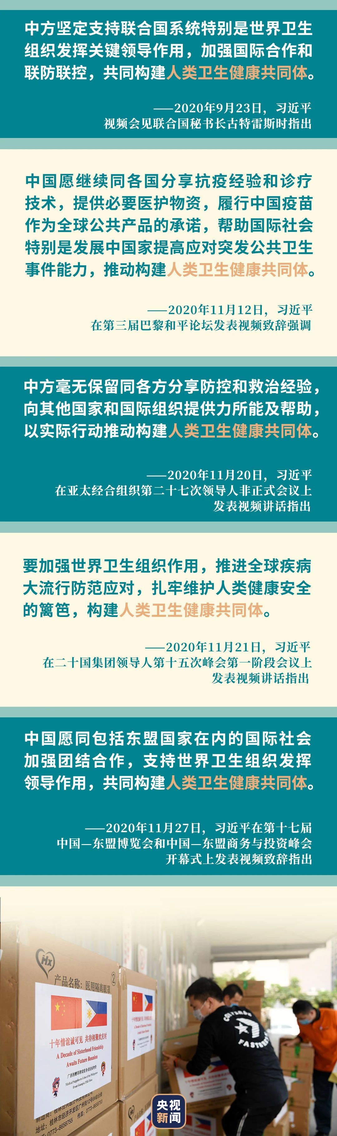 疫情发生以来,中国积极履行国际义务,密切同世界卫生组织和相关国家的友好合作,主动同国际社会分享疫情和病毒信息、抗疫经验做法。向150多个国家和10个国际组织提供抗疫援助,向34个国家派出36支医疗专家组,向各国提供2200多亿只口罩、22.5亿件防护服、10.2亿份检测试剂盒,加入“新冠肺炎疫苗实施计划”,承诺将疫苗作为全球公共产品……中国履行国际义务,发挥全球抗疫物资最大供应国作用,共同构建人类卫生健康共同体。