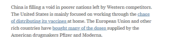 《纽约时报》日前报道说,由于美国目前主要致力于解决国内疫苗分发的混乱局面,欧盟和其他富裕国家又大量采购辉瑞和莫德纳研制的疫苗,中国正在填补西方国家在贫穷国家留下的缺口。