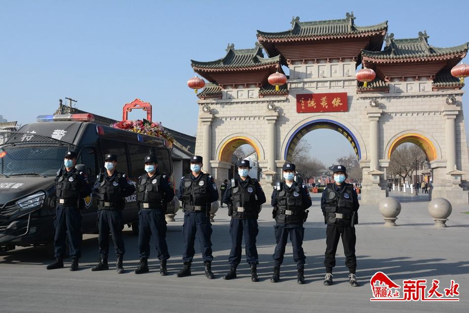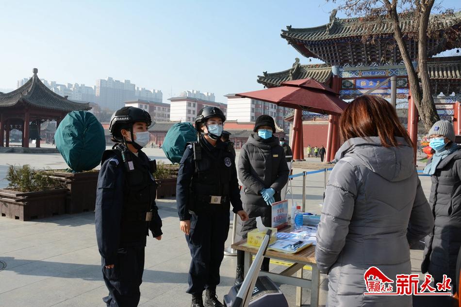 到达伏羲庙景区后,在景区门口我们整理好自己的衣服和装备,列队进入景区开始巡逻。当时上午,景区游人不多,只有几位老人坐在伏羲庙广场晒太阳、聊天,其中有一个老人没有戴口罩,赵菲菲和另一名女队员周文静,走上前提示老人佩戴好口罩,老人立即积极配合。