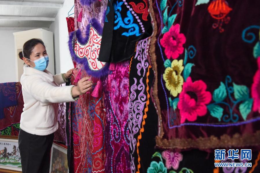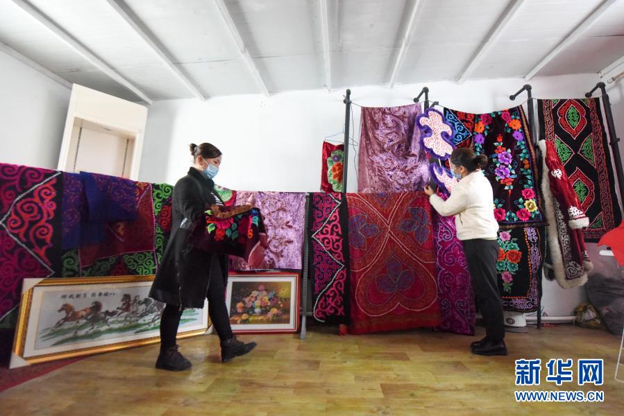 1月23日,在吉木萨尔县白泉村刺绣专业合作社,绣娘检查制作完成的哈萨克族刺绣。