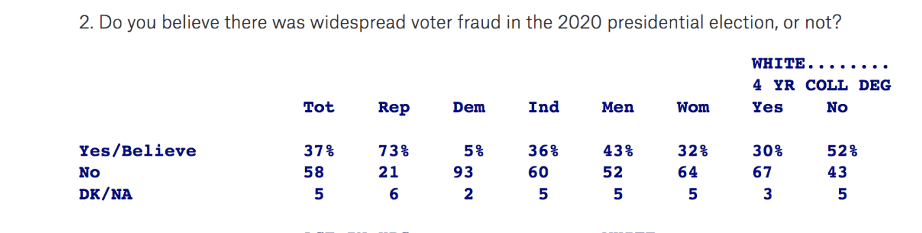 昆尼皮亚克大学(Quinnipiac University)1月11日发布的全美民意调查显示,示威者暴力冲击国会大厦之后,仍然有73%的共和党人认为2020年大选中存在“大规模舞弊”,93%的民主党人认为根本没这回事。此外,81%的共和党人认为参议院不应该对特朗普定罪,87%的民主党人则认为他应该被定罪。撕裂程度可见一斑。