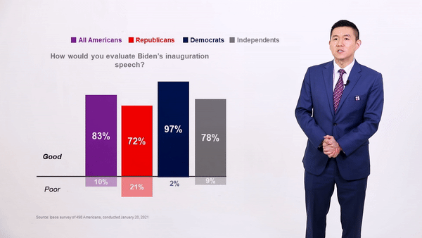 就职演说中,78岁的拜登呼吁美国民众团结起来,恳求各派不要再闹下去了。国际市场研究机构益普索(IPSOS)调查结果显示,72%的共和党人认可拜登在就职演说中释放的信息。