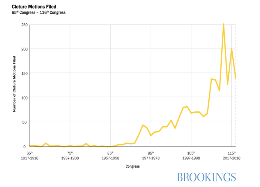 数据显示,过去十年,民主党及共和党利用阻挠议事的手段阻止对方提案的频率都大幅增加。