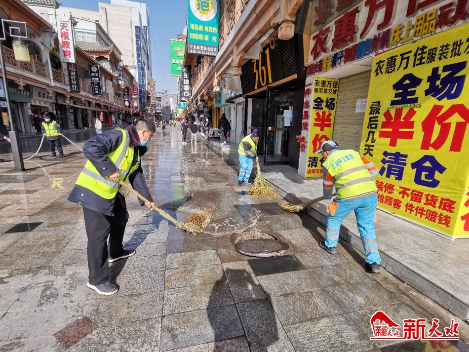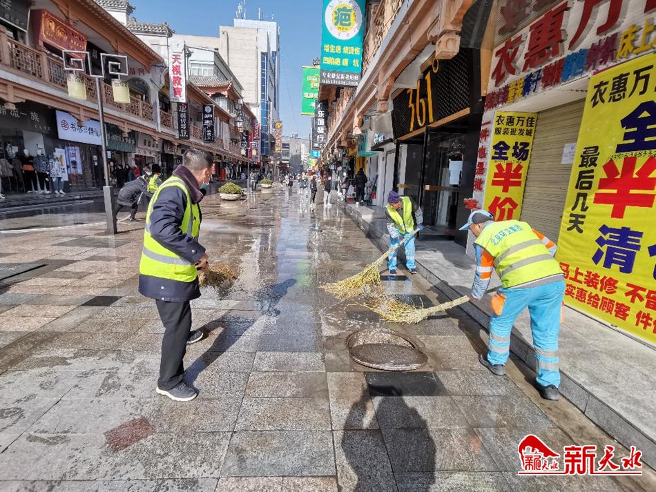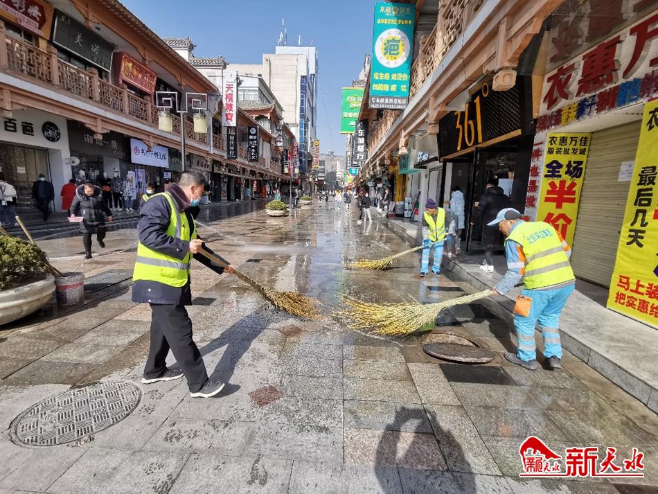 连日来,为切实做好新冠肺炎疫情防控工作,营造干净整洁、健康欢乐的节日氛围,环卫工人精心“梳妆”城市,每日刷新“干净指数”,用辛勤劳动干干净净迎接新春佳节。图为1月28日中午,环卫工人清扫秦州区中华东路步行街。【新天水记者 余碧波 摄】