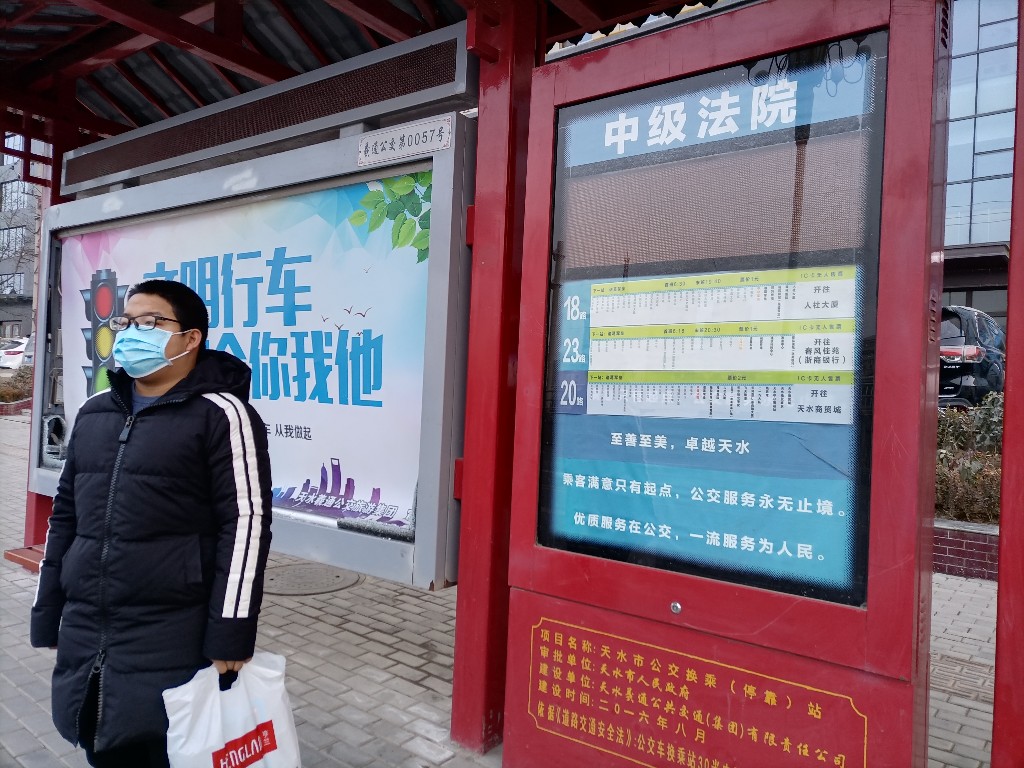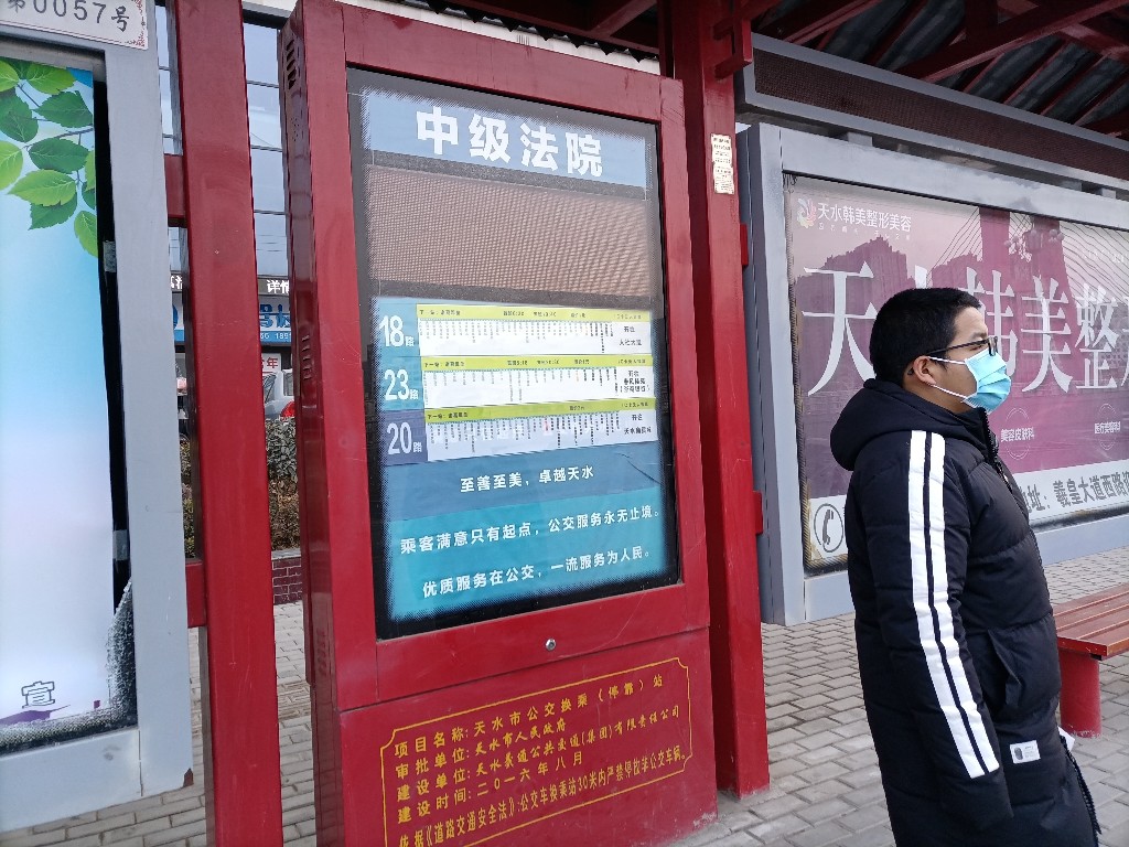 2月2日,在秦州区藉河南路中级人民法院公交车站,一名学生正在等车。据附近市民反映,该车站电子显示屏不亮已经一个多月了,给市民乘车带来诸多不便,希望公交公司尽快维修。(冰帆 摄)