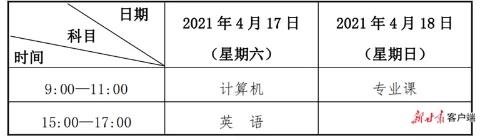 高职(专科)升本考试时间为4月17日至4月18日,考试科目分为公共课和专业课,公共课为计算机、英语,每科满分150分;专业课满分为200分。