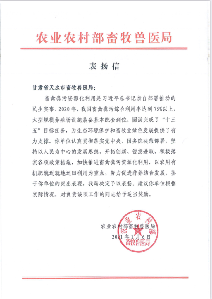 新天水讯 近日,因在加快推进畜禽粪污资源化利用,以农用有机肥就近就地还田利用为重点,努力促进种养结合发展中表现突出,天水市畜牧兽医局和6名个人获得农业农村部畜牧兽医局表扬。