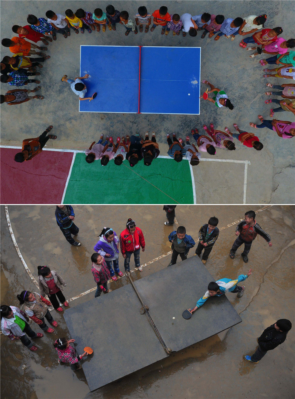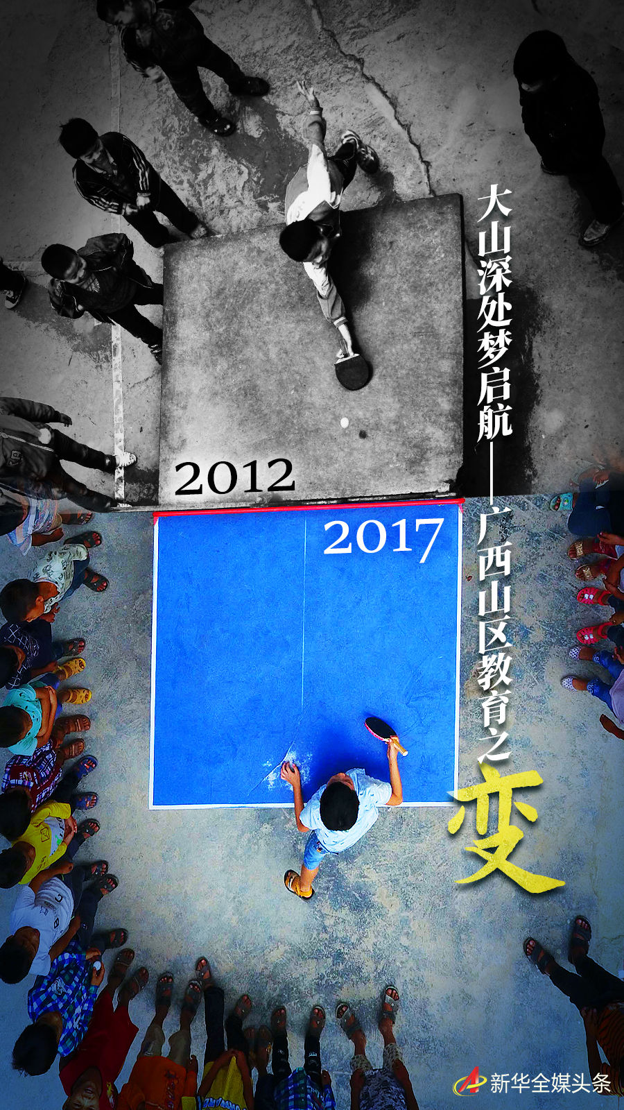 拼版照片:上图为在广西大化瑶族自治县板升乡弄勇小学,孩子们在打乒乓球(2017年9月4日摄,无人机照片);下图为在弄勇小学,孩子们在打乒乓球(2012年12月26日摄)。新华社记者 黄孝邦 摄