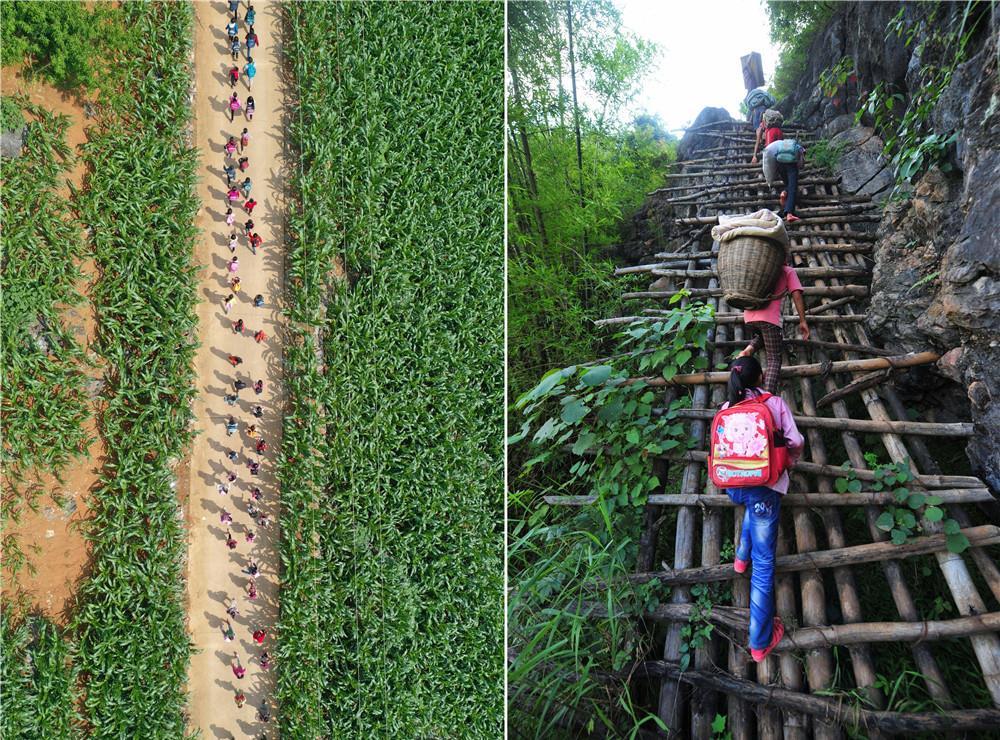 拼版照片:左图为在广西大化瑶族自治县板升乡弄勇村,孩子们走在放学路上(2019年5月10日摄,无人机照片);右图为在弄勇村弄顶屯,孩子们扛着生活用具,爬悬梯回家(2012年7月4日摄)。目前,弄勇村所有的屯都已告别没有公路的历史。新华社记者 黄孝邦 摄