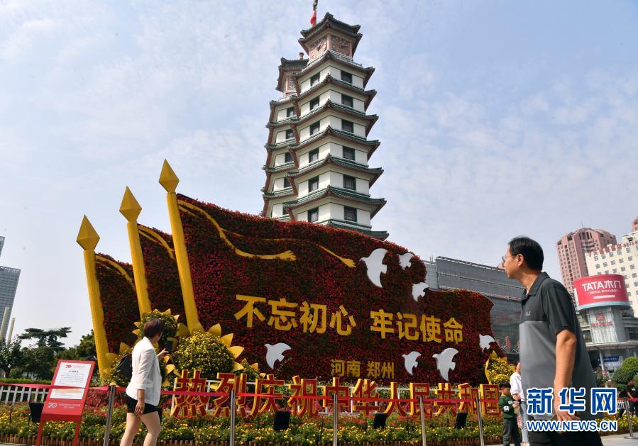 游客在郑州二七纪念塔前(2019年10月2日摄)。新华社记者 李嘉南 摄