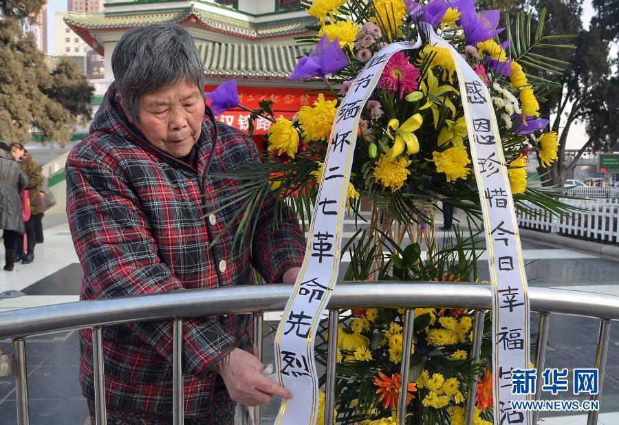 一名郑州市民在二七纪念塔前敬献花篮(2012年2月7日摄)。新华社记者 王颂 摄