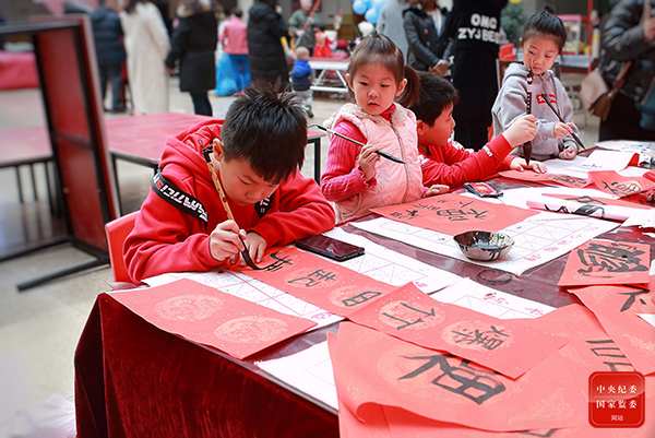 云南省昆明市五华区大观街道举办新春社区活动,孩子们聚在书法桌前,小手起笔写春联,体验传统民俗,共迎新春佳节。(云南省昆明市五华区纪委监委供 李鸿斌 摄)