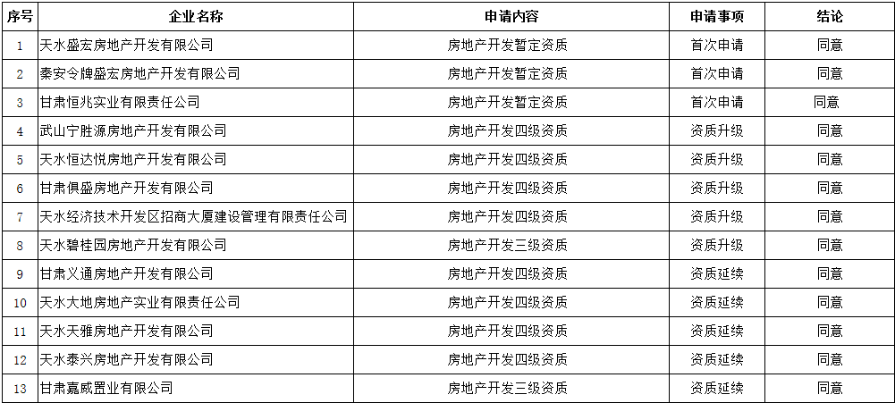 天水市2021年第二批房地产开发企业资质审查意见的公示