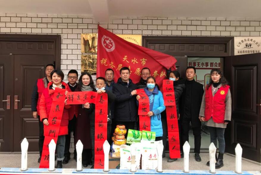 2月4日,天水市税务局机关党员志愿者来到结对帮扶的秦州区七里墩街道岷山社区开展“送福到家”结对共建志愿服务以及新春慰问活动。 当天,市税务局党员志愿者通过发放宣传单的方式,向社区居民讲解相关环保及安全知识,叮嘱居民要提高生活安全意识,携手打造平安社区。并现场为社区生活困难的三个家庭送上米、面、油、茶叶等生活日用品,为居民送上新春的祝福。 (闫迪)