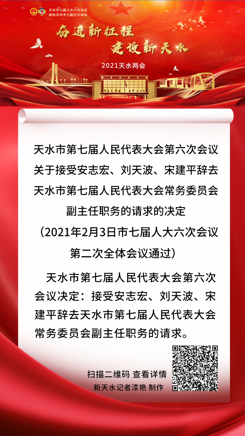 天水市第七届人民代表大会第六次会议关于接受安志宏、刘天波、宋建平辞去天水市第七届人民代表大会常务委员会副主任职务的请求的决定