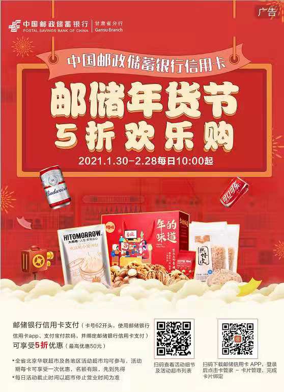 2021邮储年货节重磅来袭,邮储银行信用卡给大家拜大年,送福利,5折欢乐购。