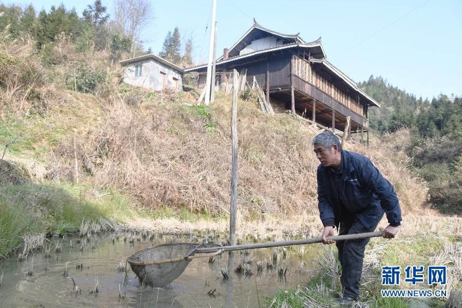 58岁的兵书阁村农民吴泽文在自家屋门前捞禾花鱼(1月28日摄)。新华社记者 周勉 摄