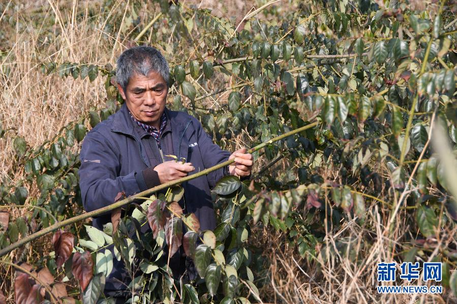 58岁的兵书阁村农民吴泽文在打理自家的钩藤(1月28日摄)。新华社记者 周勉 摄