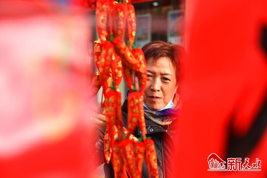 年货市场,红辣椒,象征事业红红火火;红玉米,预祝来年五谷丰登。各式各样的红灯笼、纸窗花、春联、布艺鞭炮和大红的“福”、“春”字等喜庆挂饰让人目不暇接,吸引了不少过往行人驻足选购,到处洋溢着喜迎新春佳节的氛围。