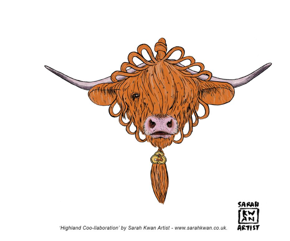 来自爱丁堡的华裔艺术家Sarah Kwan创作了一组“当东方遇到西方”(East Meets West)的牛年贺卡, 她把苏格兰高地牛与传统的中国结相结合,碰撞出不一样的火花。