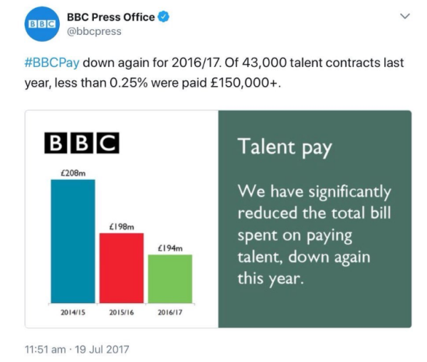 在BBC发布的一份财务情况通报中,BBC在文字中表示该机构在2014-2016年期间节约了不少开支,并配上了一幅反映开支下降的柱状图。