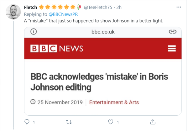 在上面这个网友提到“偏向保守党”后,许多其他网友纷纷表示赞同,其中被最多网友列举的证据,来自于BBC在2019年11月的一个“剪辑事故”。