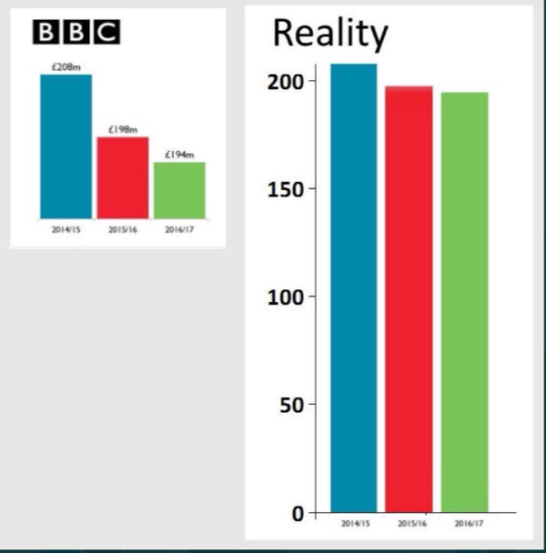 这位老师表示,自己班上的学生一眼就看出了BBC玩的把戏。为了凸显自己“节约开支成效巨大”,BBC的柱状图(下左)明显调整了比例尺和坐标轴,让经费变动的部分在图表里,比正常做图(下右)时显得要更加明显。