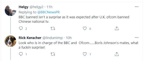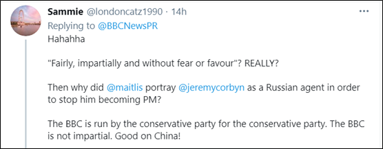 因此,在这个例子下面,就有好几位英国网民指责BBC长期偏向英国保守党,根本没资格自称“客观公正”,其中一位还表示“中国这次干得漂亮!”