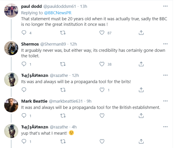 必须说明的是,并非所有外国网民对BBC的批评都是出于“声援中国”的目的。但作为一个长期介入英国内外政治报道的媒体,BBC的许多做法一直和它在声明中自称的“中立客观”大相径庭,这也导致其在发布声明没多久,就遭遇了持有不同立场的各路网民们,从各自关注角度对BBC的“集中开火”。