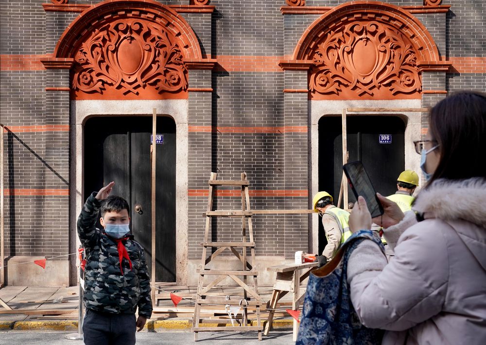 2月4日,上海市民林女士在修缮中的中共一大会址前为小学三年级的儿子拍照。新华社记者 刘颖 摄