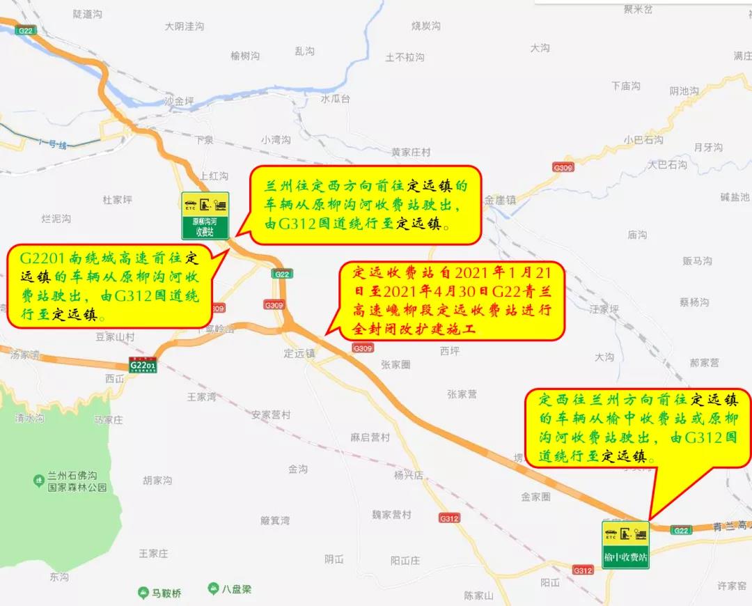 ②兰州往定西方向前往定远镇的车辆从原柳沟河收费站驶出,由G312国道绕行至定远;