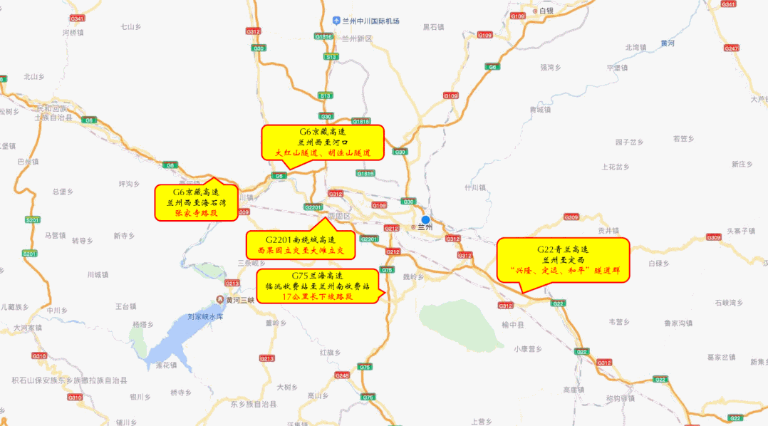 G6京藏高速兰州西至海石湾,大红山隧道、胡洼山隧道、张家寺路段;