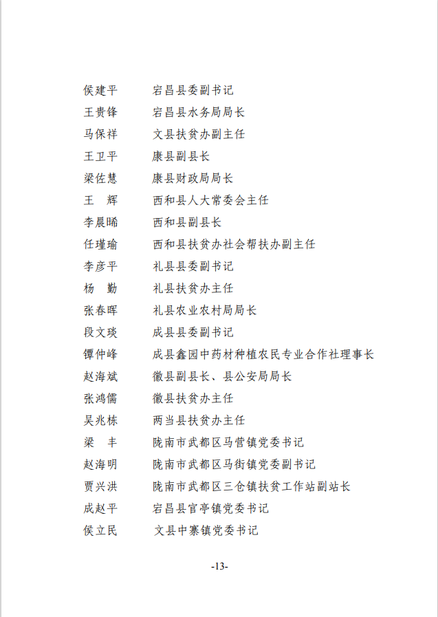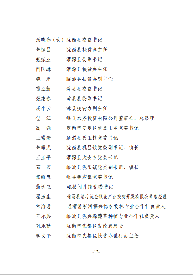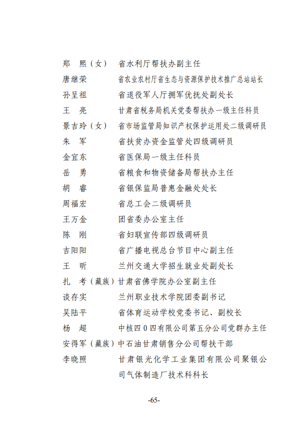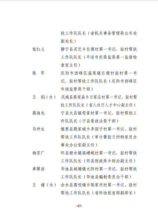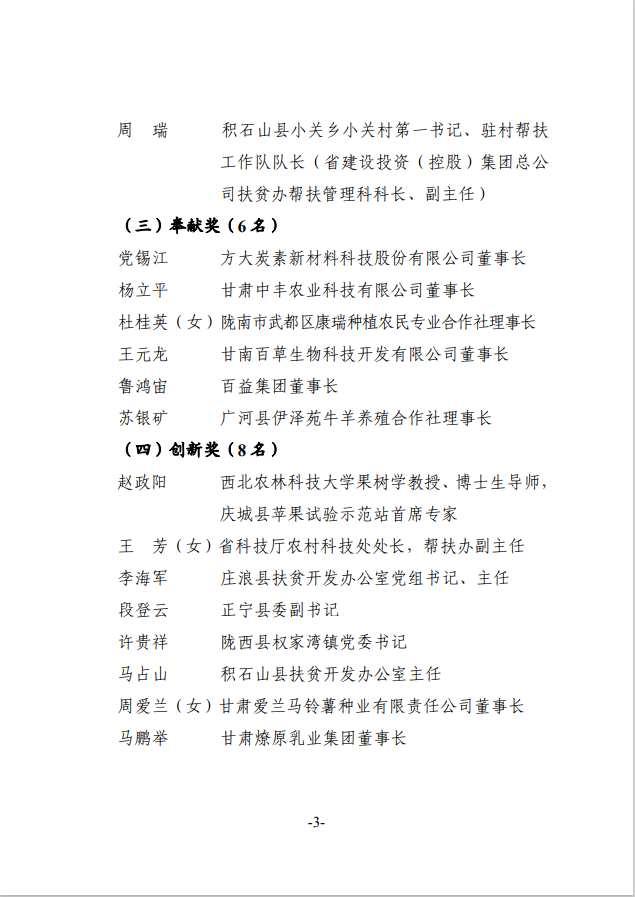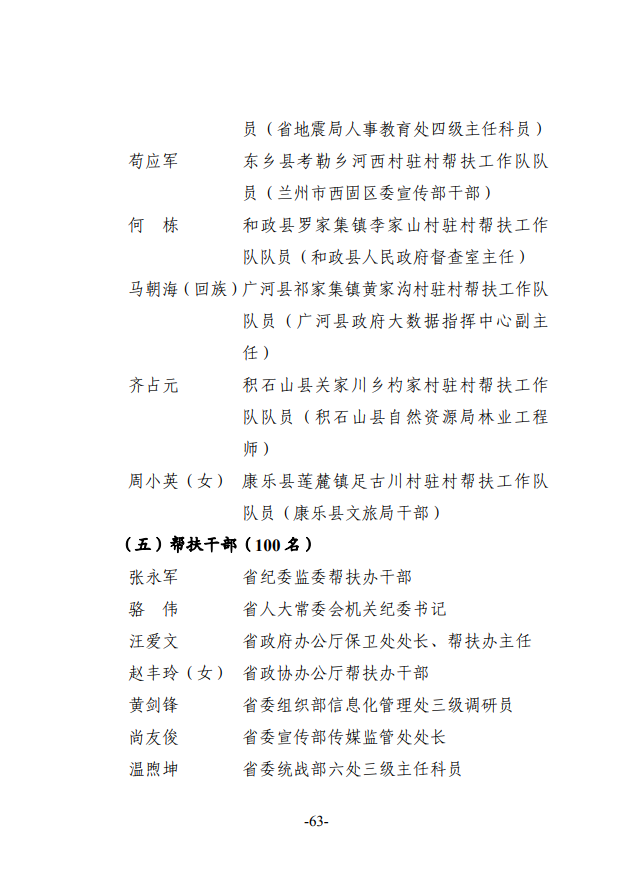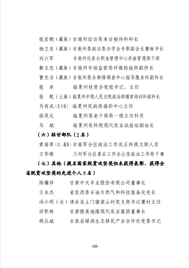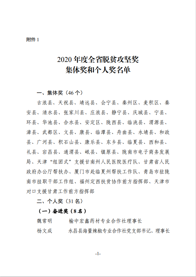 根据《甘肃省脱贫攻坚奖励办法》(甘办发〔2018〕45号),在自下而上、逐级推荐、层层审核的基础上,经省脱贫攻坚领导小组专题会议审定,拟对46个全省脱贫攻坚奖先进集体、31名全省脱贫攻坚奖先进个人、100个全省脱贫攻坚先进集体、200名全省脱贫攻坚先进个人、212个全省脱贫攻坚帮扶先进集体、440名全省脱贫攻坚帮扶先进个人进行表彰奖励,现予以公示。