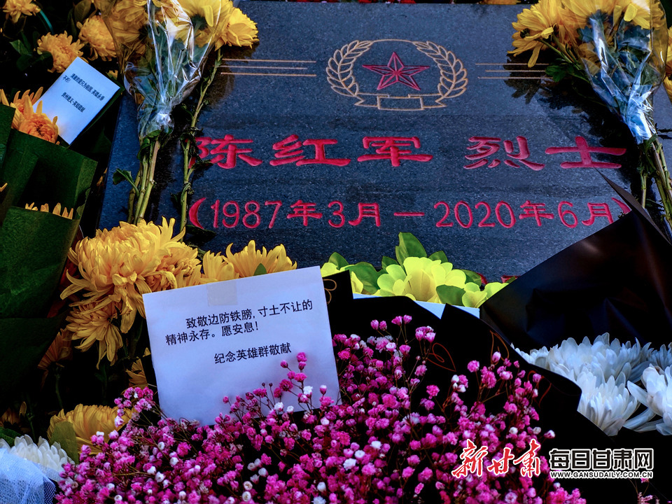 新甘肃客户端兰州2月20日讯(新甘肃·每日甘肃网记者韦德占)今天下午,和煦的阳光透过葱郁的松柏,洒向兰州市烈士陵园墓地。英魂苑庄严肃穆,刻有“陈红军烈士(1987年3月—2020年6月)”几个大字的方形墓碑巍然矗立。碑前安放的遍地鲜花,寄托着人们对烈士的怀念和敬意。