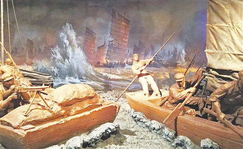 渡江战役纪念馆内展示的人民群众送军过大江群雕,再现了参与渡江的最小船工、14岁的马毛姐(中)帮助人民解放军划船渡江的场景。丁立群摄