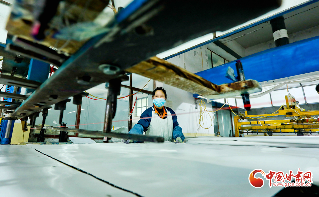 2021年2月22日,甘肃张掖一纺织品公司织布车间内工人们正在紧张有序地进行产业用纺织品裁剪。