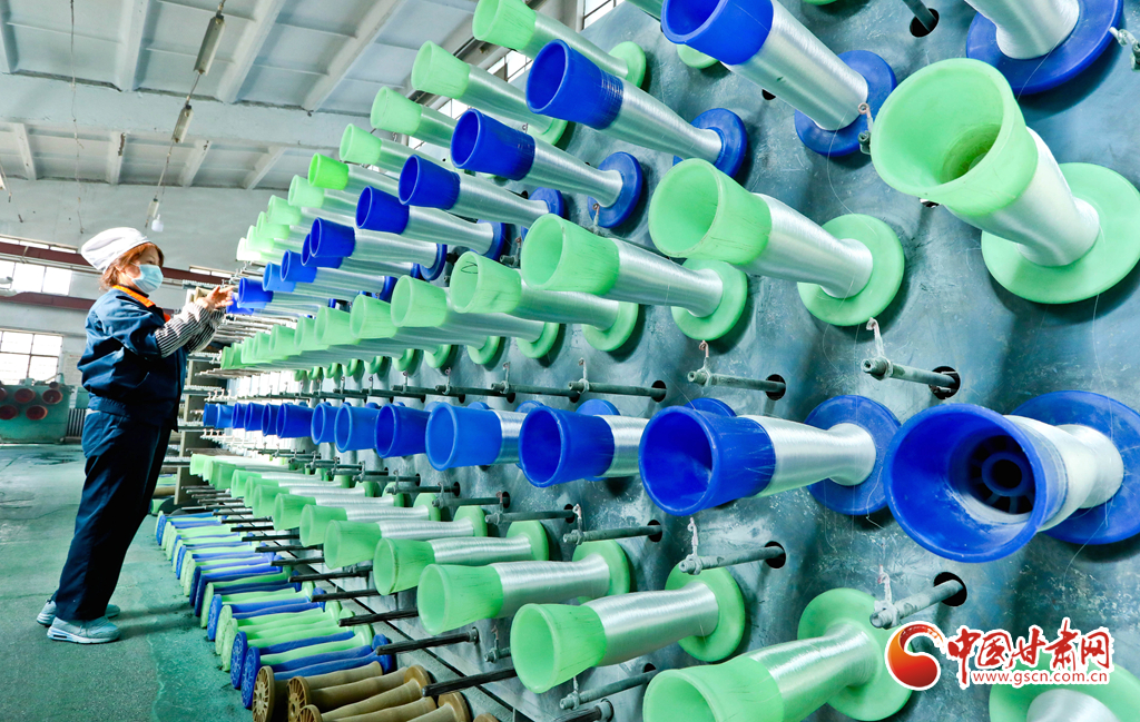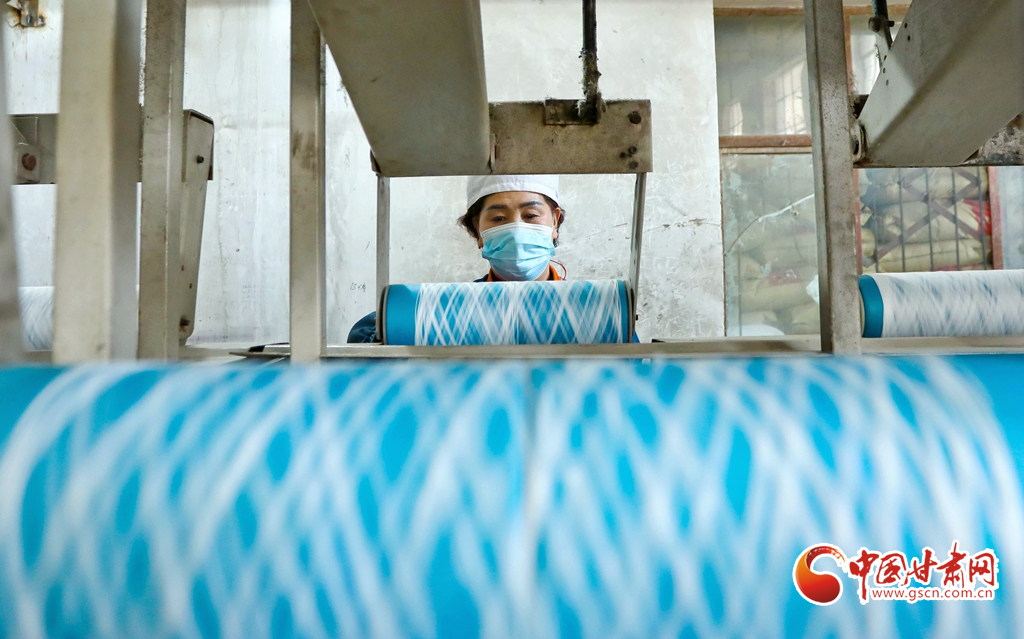 2月22日,甘肃张掖一纺织品公司织布车间内工人们正在紧张有序地进行产业用纺织品织布拉丝。