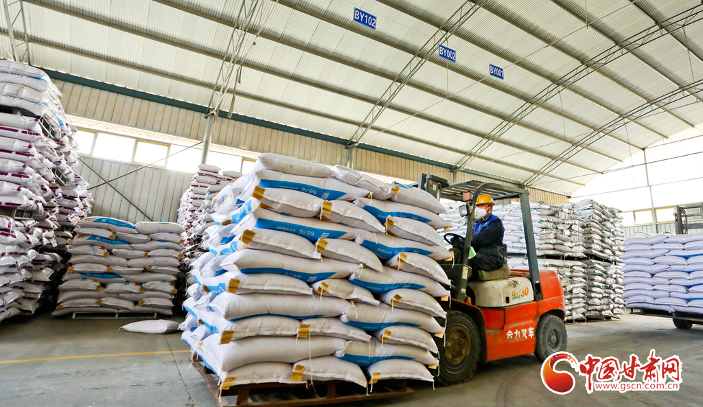 2月22日,甘肃张掖一饲料公司内工人们正在紧张有序地将加工好的饲料准备装车发运。