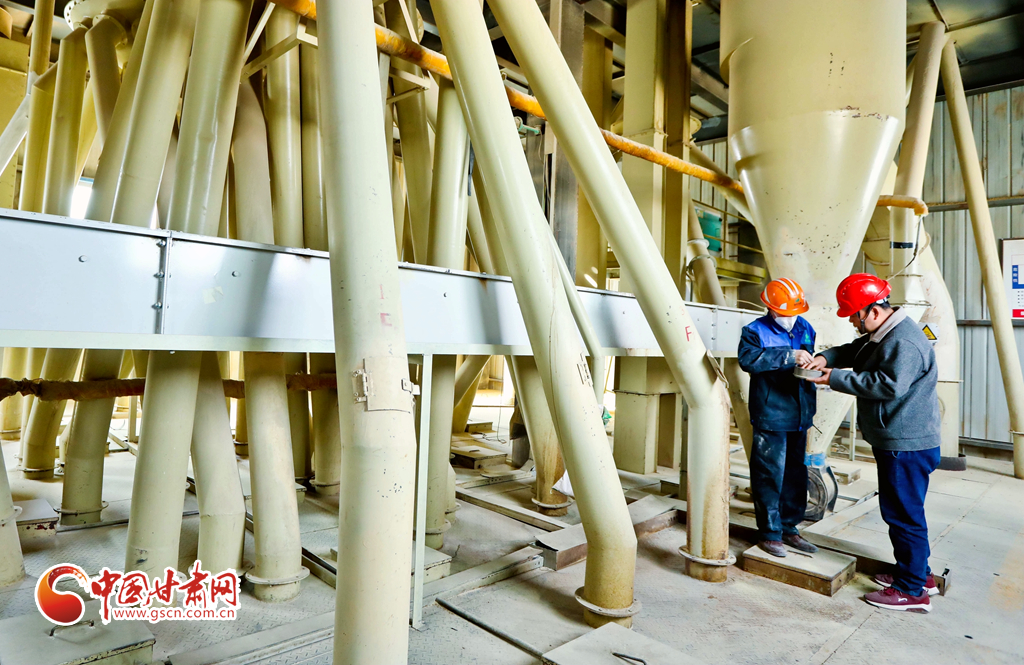 2月22日,甘肃张掖一饲料公司内工人们正在查看饲料加工情况。